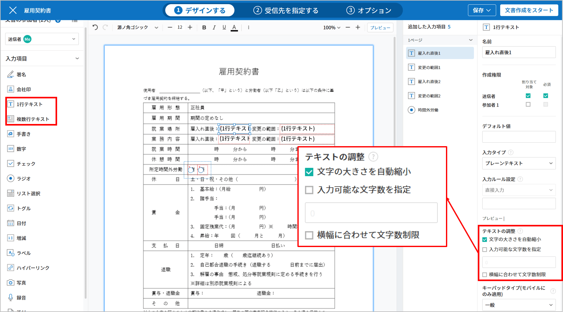 • 設定すると、入力項目のサイズに合わせて文字サイズが自動で縮小され、文字サイズが最小値(4pt)になるとそれ以上入力することはできません。