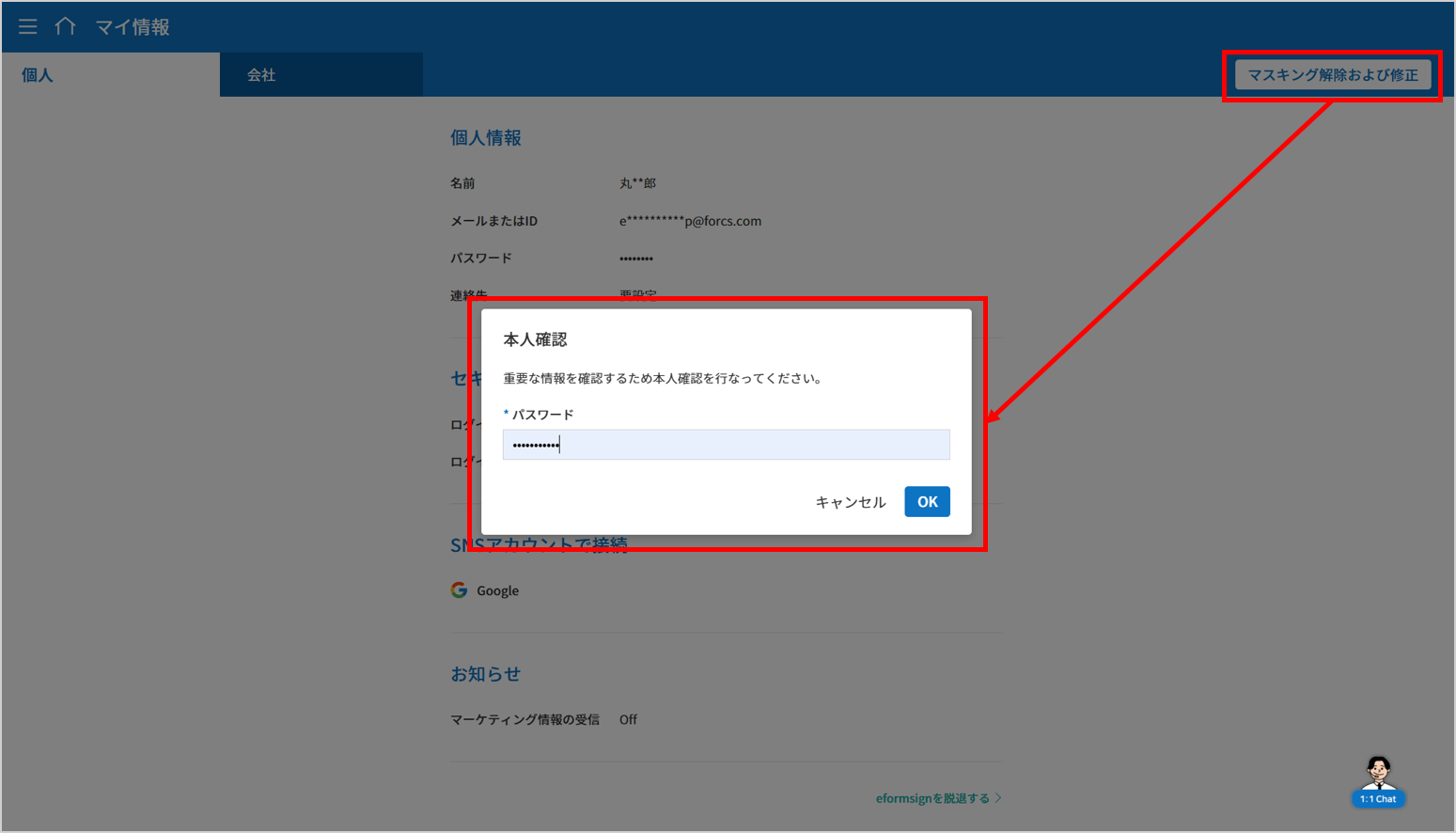 個人情報保護のため、マイ情報メニューにて、名前・メールなどの主要個人情報がマスキングされて表示されます。情報の確認と修正はパスワード入力などのログイン認証後に可能です。
