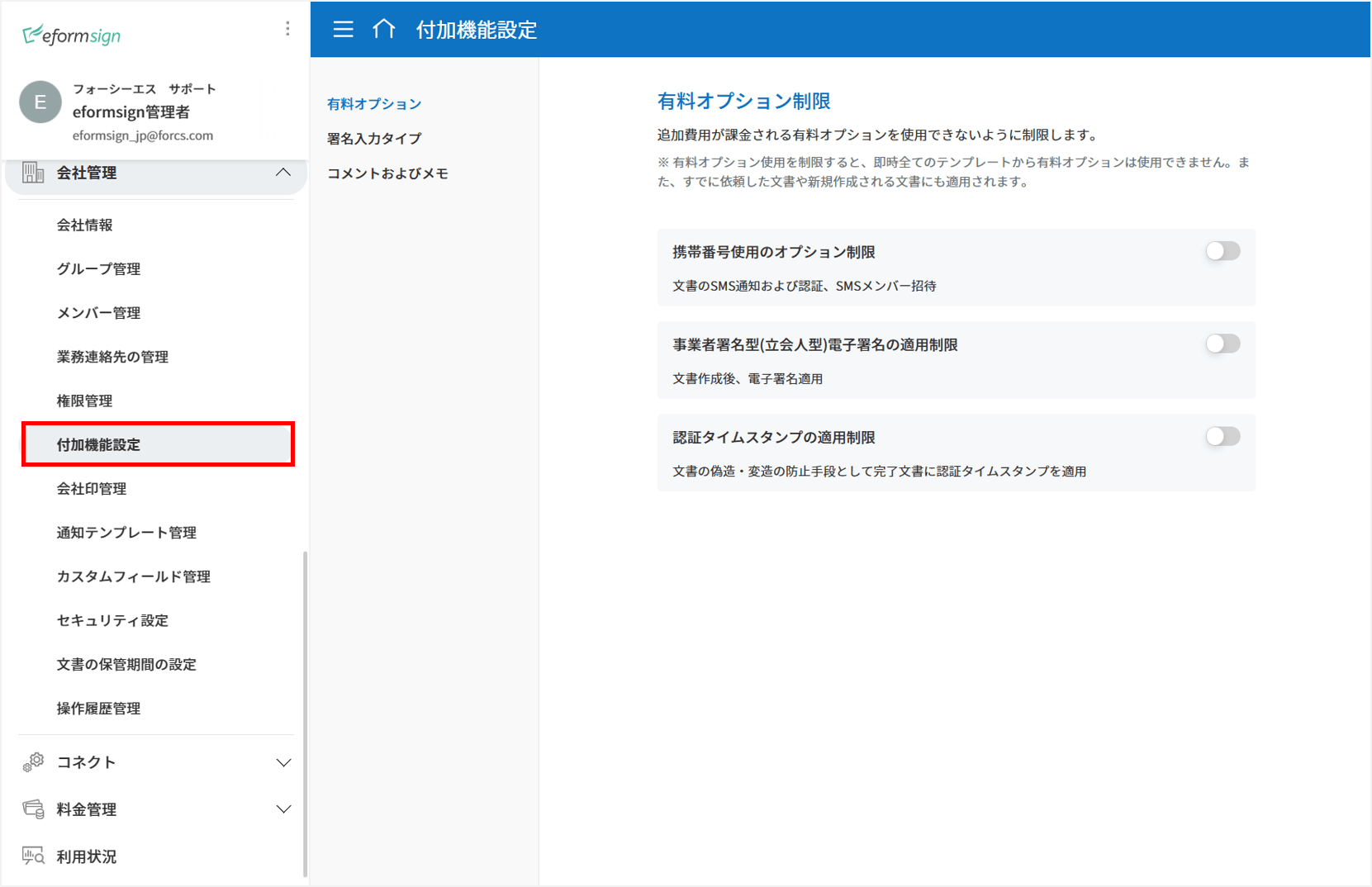2. 各メニュー(有料オプション、署名入力タイプ、コメントおよびメモ)をクリックし、当該機能の使用可否を設定します。