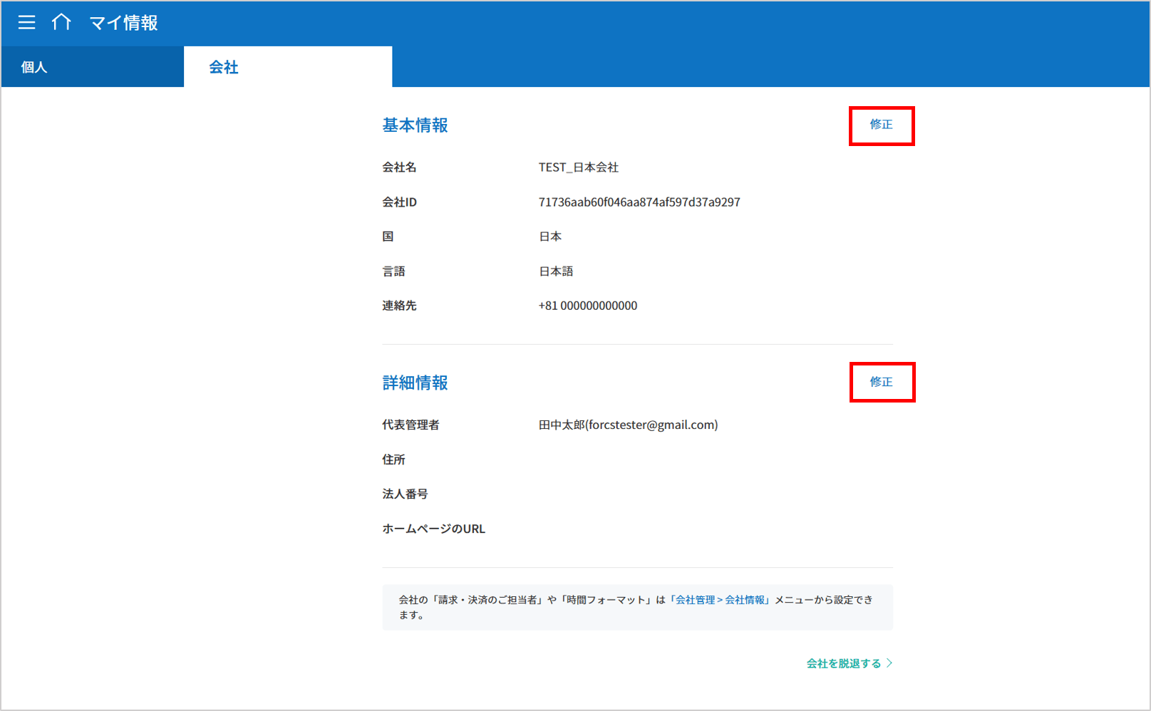 会社名は会社管理メニューでのみ変更可能でしたが、マイ情報 > 会社でも会社名と基本・詳細情報を修正できるようになりました。 (代表管理者または会社管理者権限が必要)