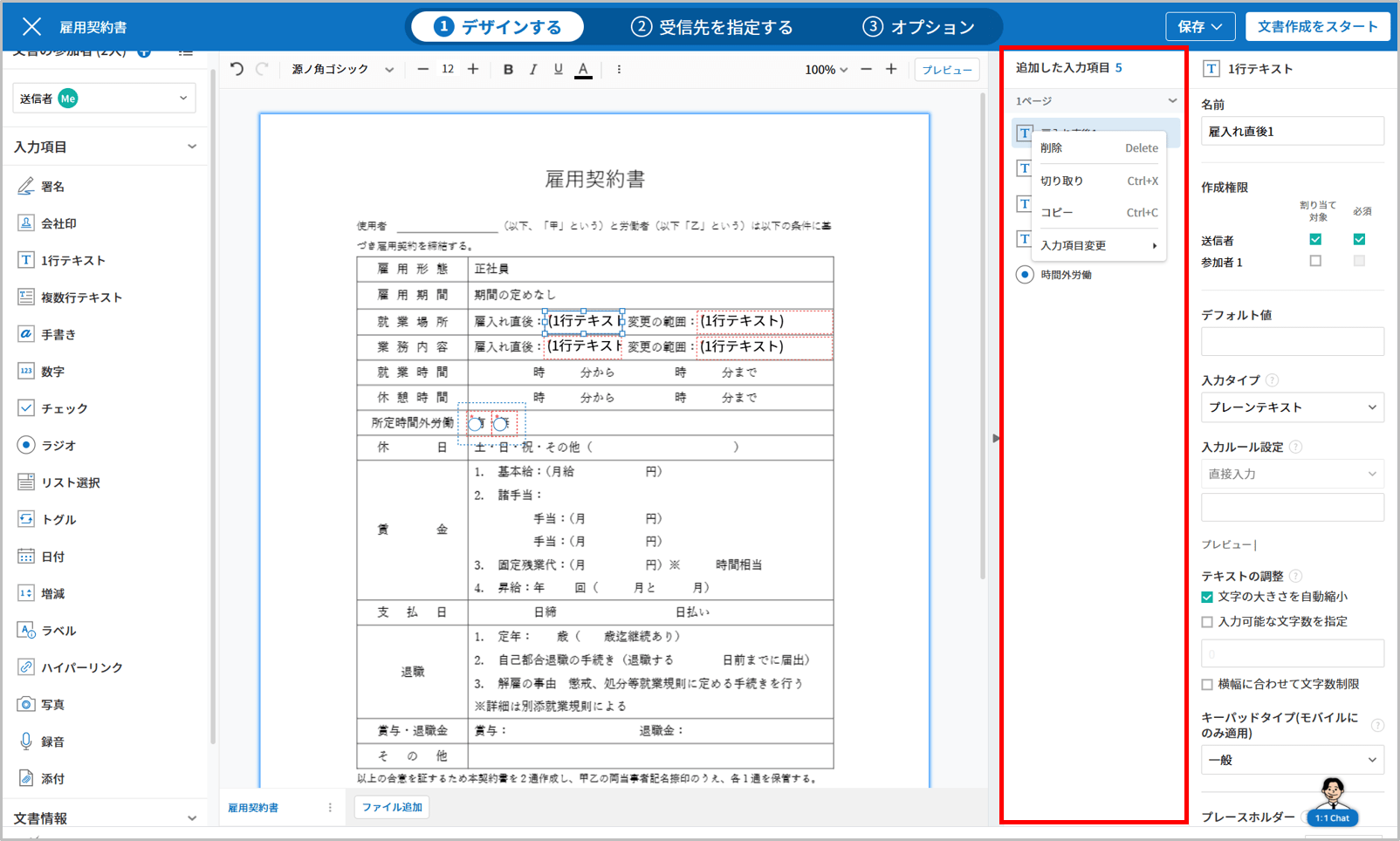 入力項目リストではテキスト・チェックボックス・署名など、追加されたすべての入力項目を確認することができ、項目名をクリックすると当該入力項目の位置に移動し、入力項目変更・コピー・切り取り・削除などの様々な便利機能を提供します。