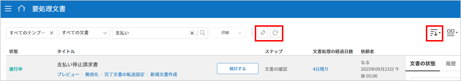 文書トレイなど主要なメニューに並べ替えボタンと検索条件の初期化、検索条件の固定(Pin)機能が追加され、必要な文書をより迅速かつ直感的に検索できるようになりました。