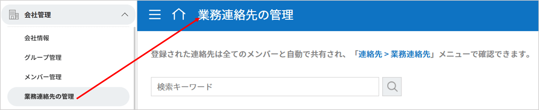 1. 会社管理 > 業務連絡先の管理メニューへ移動します。