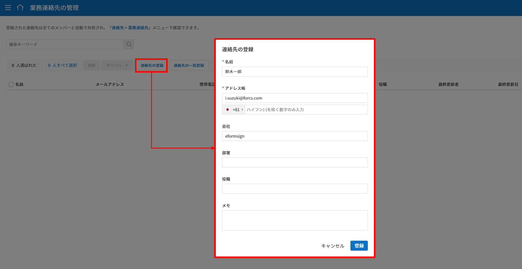 6. [登録] ボタンをクリックすると連絡先が一括登録されます。