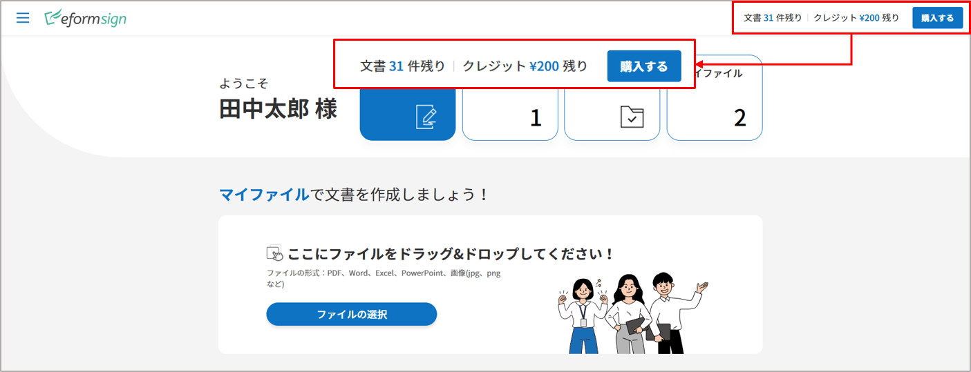 ダッシュボードで利用中の料金プランと残りの文書件数をリアルタイムで確認できます。管理者はダッシュボード上部で状況を素早く把握し、必要に応じて料金プランの購入・チャージページに移動できます。