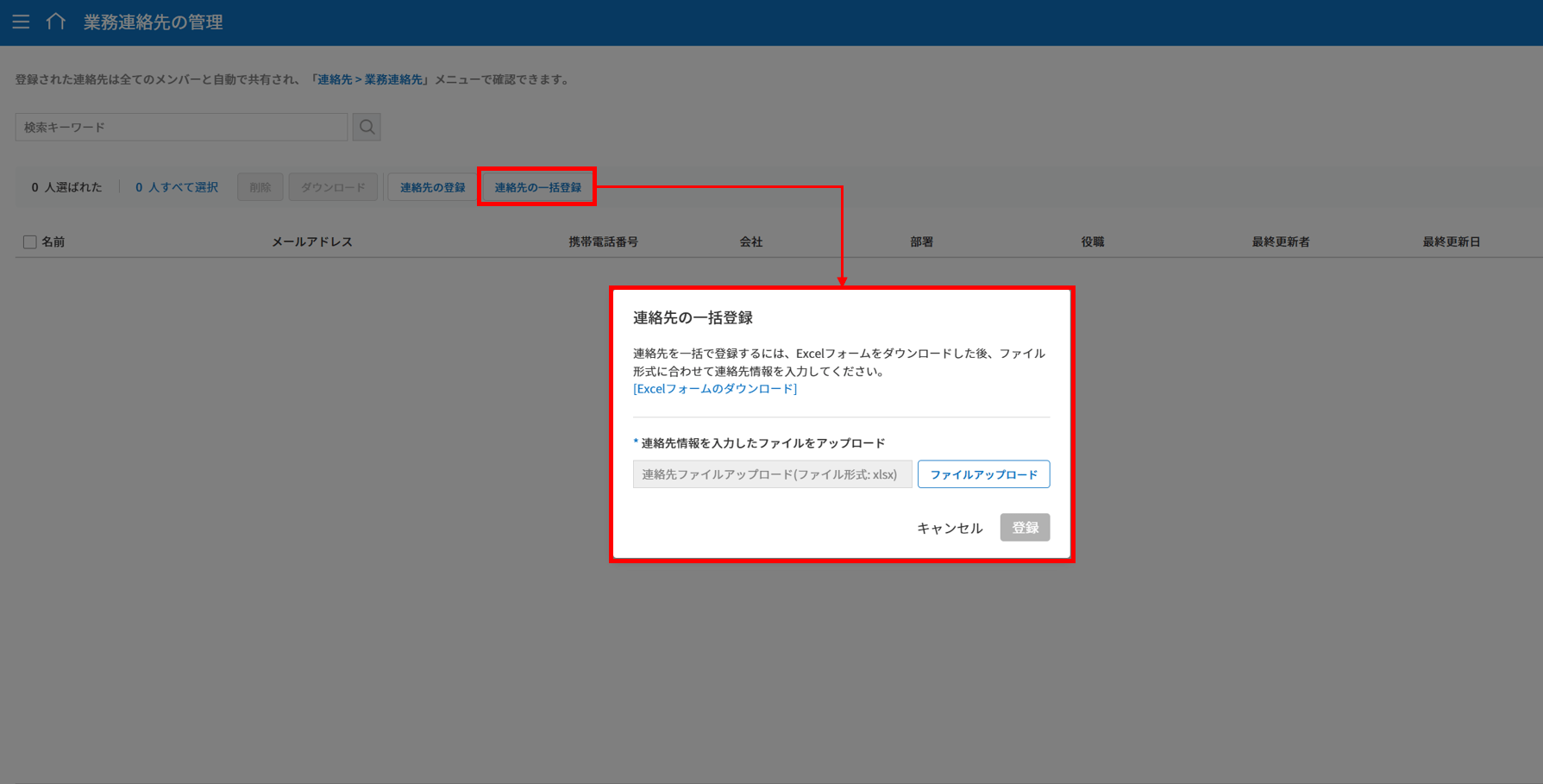 2. 画面上部の連絡先の一括登録ボタンをクリックします。