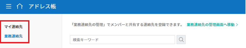 1. アドレス帳 > マイ連絡先メニューまたは会社管理 > 業務連絡先の管理メニューに移動します。