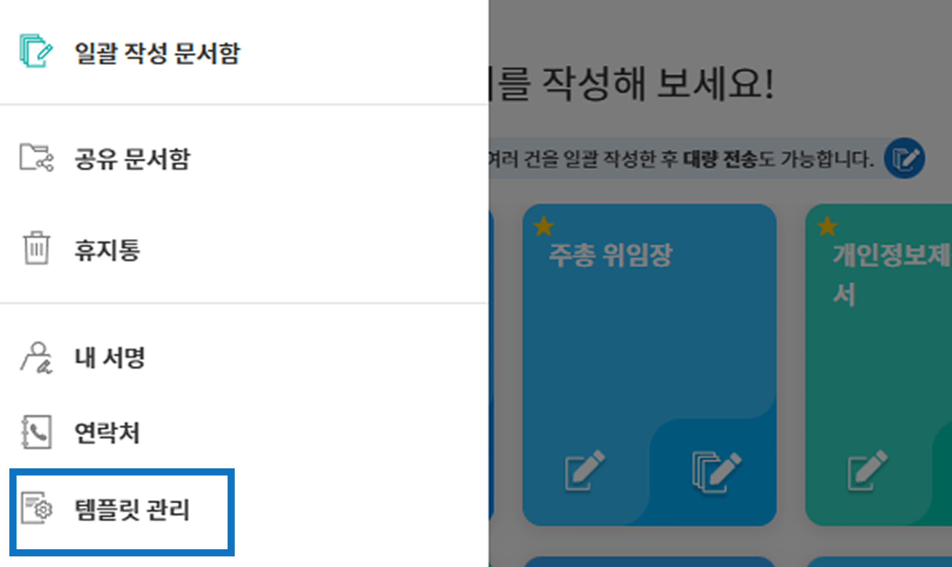 1. 좌측 메뉴에서 [템플릿 관리]를 클릭하세요. 다음 우측 상단의 [새 템플릿 만들기]를 눌러 계약서 템플릿을 생성할 서식을 불러옵니다.