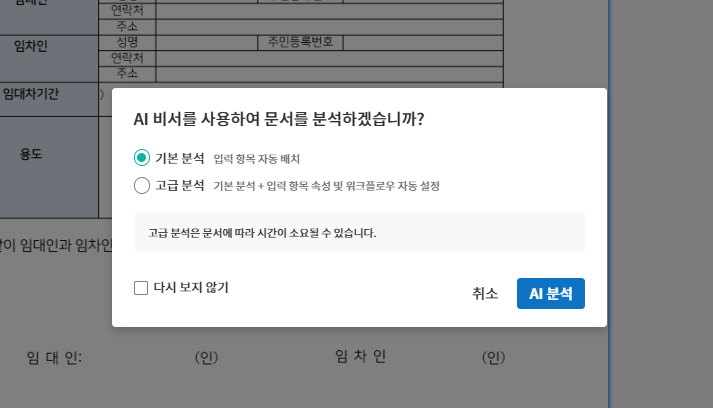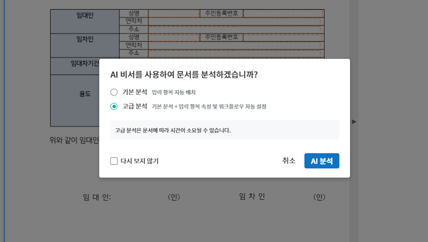 1. 지금 이폼사인 AI 전자계약 무료체험을 시작해 보세요!🎅 [내 파일로 문서 작성] 에 서식을 불러온 후 [AI비서] 분석 창을 확인하세요. 입력 항목 자동 배치가 가능한 [기본 분석], 기본 분석 기능을 포함해 속성, 워크플로우까지 자동 설정하는 [고급 분석] 중 선택합니다.