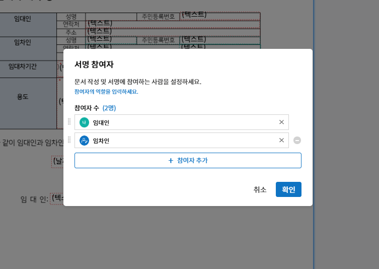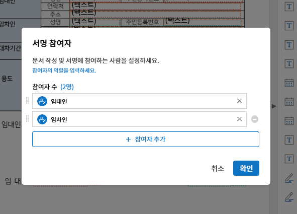 3. 먼저 AI 비서로 자동 설정된 [서명 참여자] 를 확인하세요. 예를 들어 임대차계약서에서는 임대인과 임차인이 자동 설정되었어요!