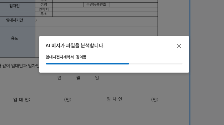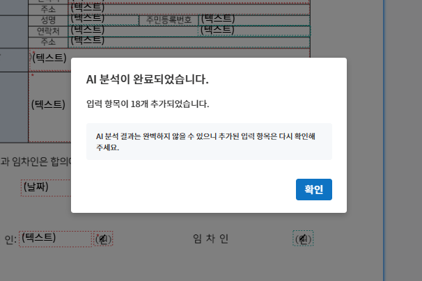 2. AI 분석 유형을 결정한 후 [AI 분석] 을 누르면 AI 비서 문서 분석 시작! 불러온 문서의 내용과 구조가 자동으로 읽혀요👨‍💻 분석이 끝난 후에는 서명자의 입력 항목이 알아서 배치되죠💫