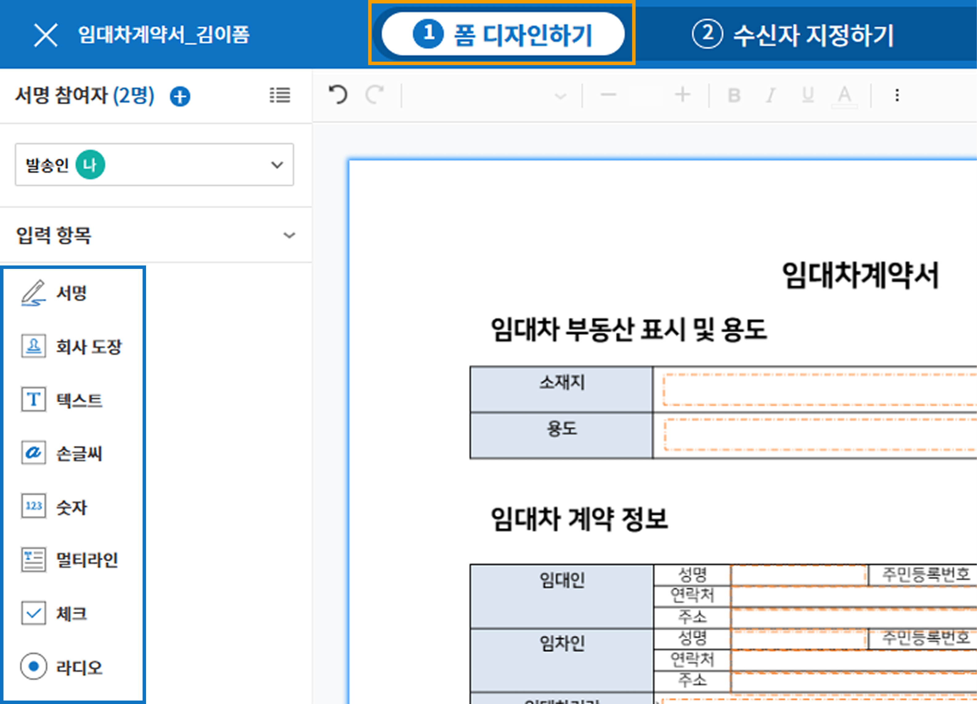 2. [폼 디자인하기] 에서 원하는 [입력 항목] 을 내용 입력이 필요한 위치에 추가해 주세요. 그리고 서명 시 상대방이 적합한 내용을 입력할 수 있도록 항목의 크기도 조정해 줍니다.