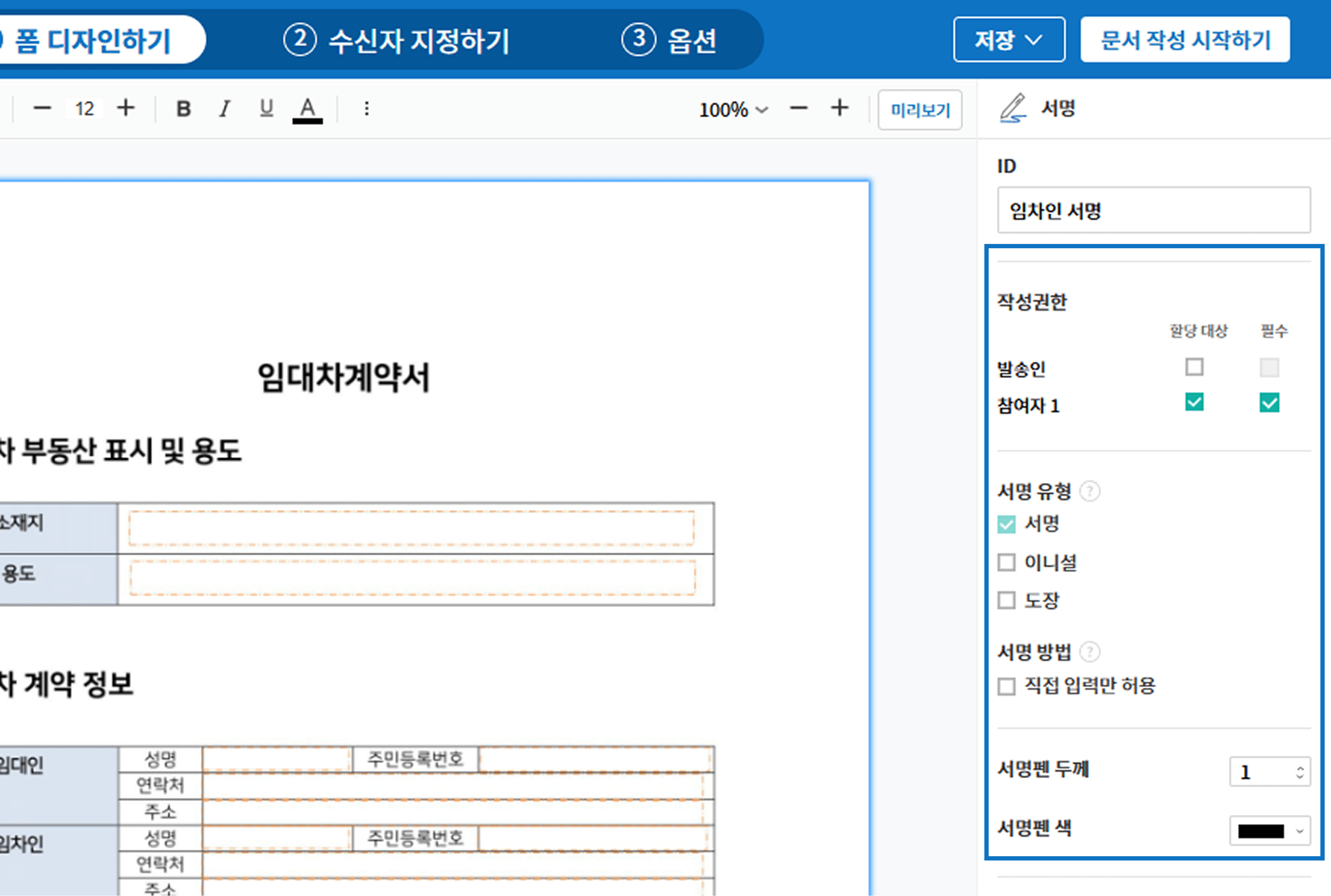 3. 각 [입력 항목] 에서는 우측 메뉴를 통해 필요한 설정을 진행할 수 있습니다. 예를 들어 [서명] 항목에서는 작성 권한, 서명 유형 및 방법, 서명펜의 두께와 색상을 변경할 수 있어요!