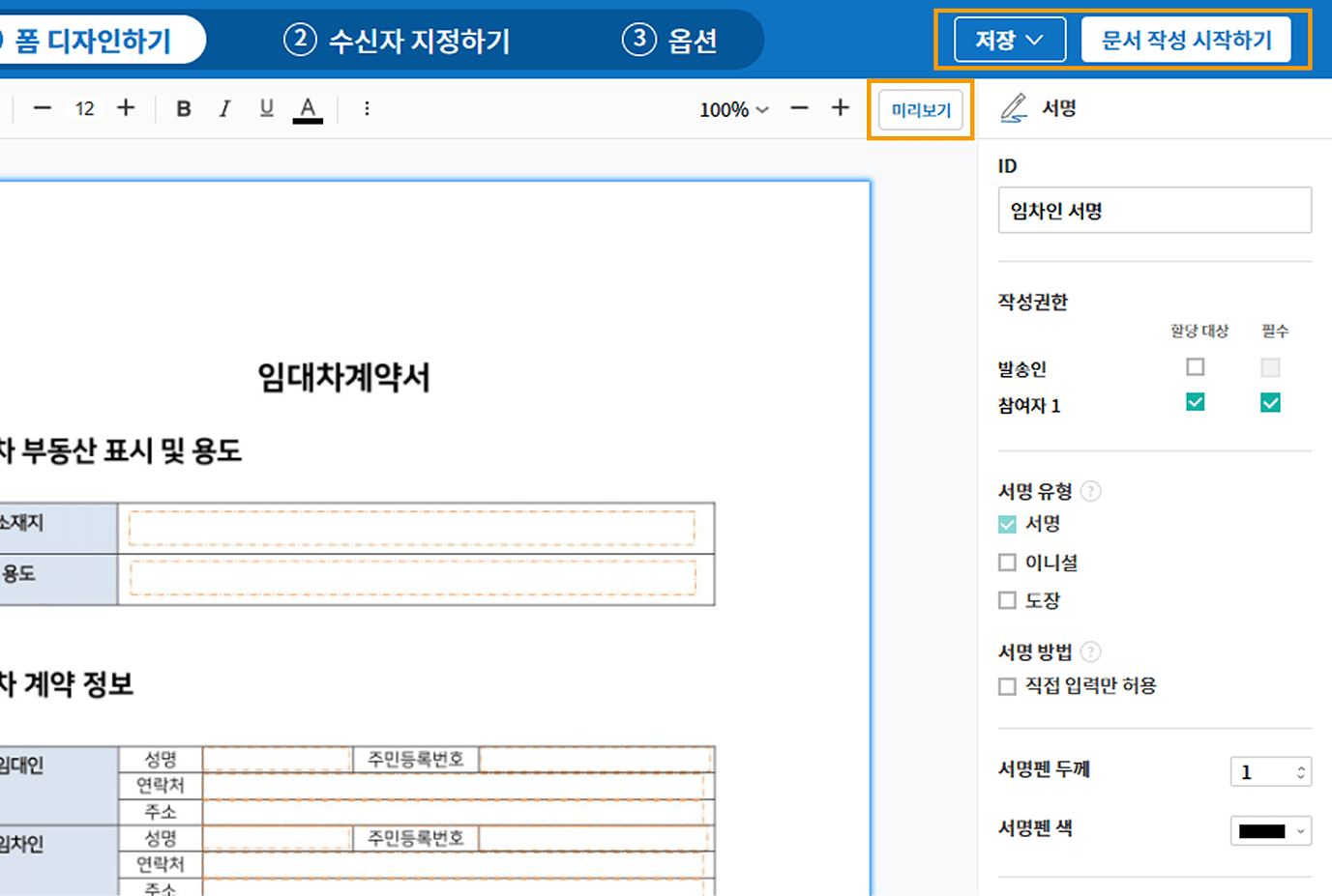 4. 입력 항목을 추가하여 계약서를 완성하였다면, [미리보기] 에서 준비된 전자계약서를 확인할 수 있습니다. 검토가 모두 끝났나요? [문서 작성 시작하기] 를 눌러 서명을 요청하고, 전자계약을 시작하세요🤗✨