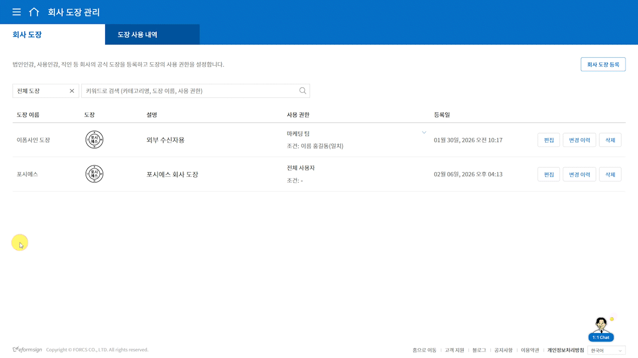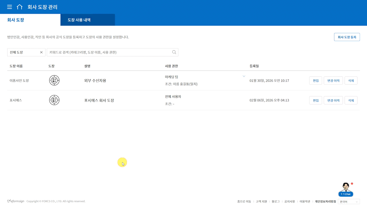 회사 도장 관리에서는 등록된 도장에 대한 모든 변경 이력을 확인할 수 있습니다.
