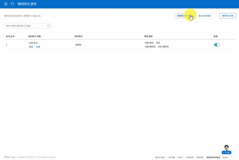 1. 회사 관리 > 워터마크 관리 메뉴에서 적용할 워터마크의 상태를 활성화합니다.