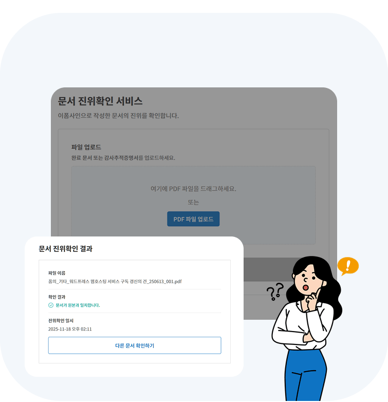 👉 문서가 한 번이라도 수정되면 즉시 탐지할 수 있어 신뢰할 수 있는 증적 관리가 가능합니다.