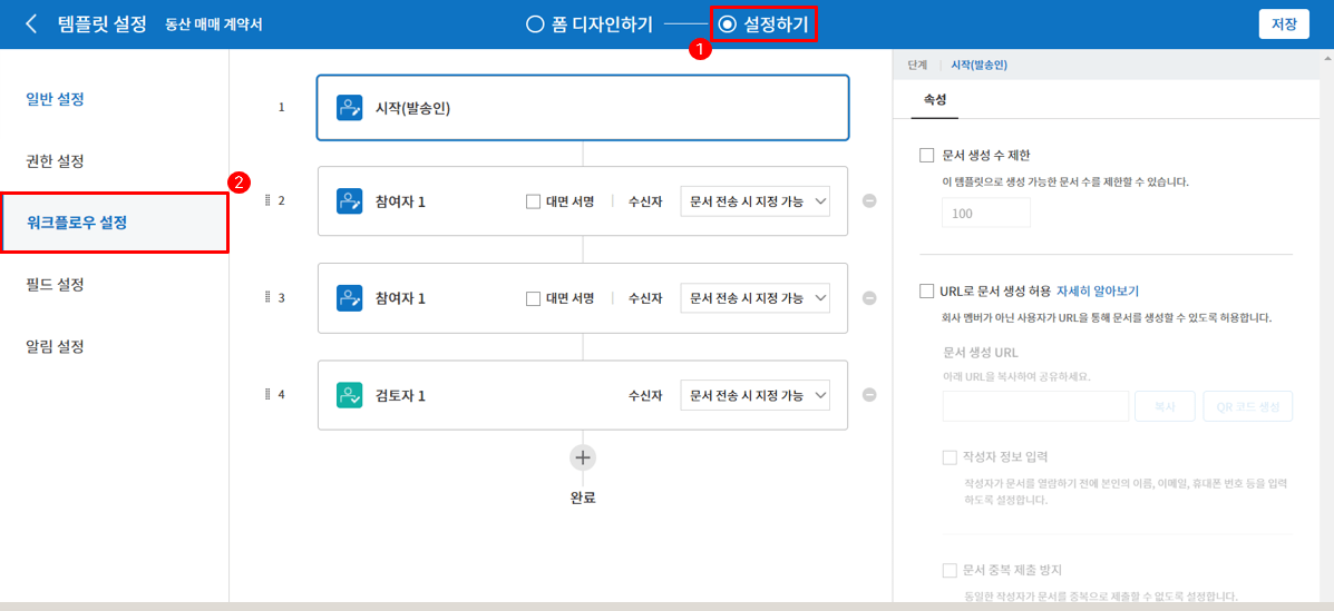 4. 워크플로우의 시작 단계를 클릭하고 화면 우측의 속성창의 ‘문서 생성 수 제한’ 체크를 클릭하여 해제하면 해결 가능합니다.