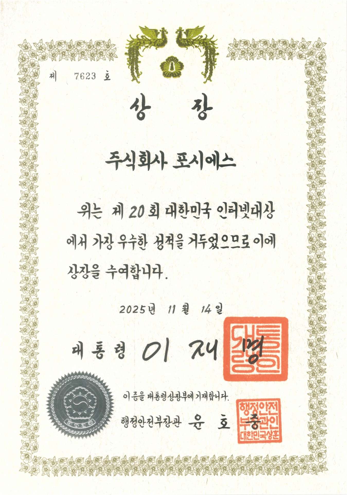 포시에스 이폼사인이 과학기술정보통신부 주관 ‘제20회 대한민국 인터넷대상’에서 최고의 영예인 대통령상을 수상했습니다. AI 기반 클라우드 전자문서 플랫폼 기술을 확보하고 상용화함으로써 공공과 민간의 디지털 전환과 사회적 디지털 포용성 확산에 기여한 공로를 인정받았습니다.