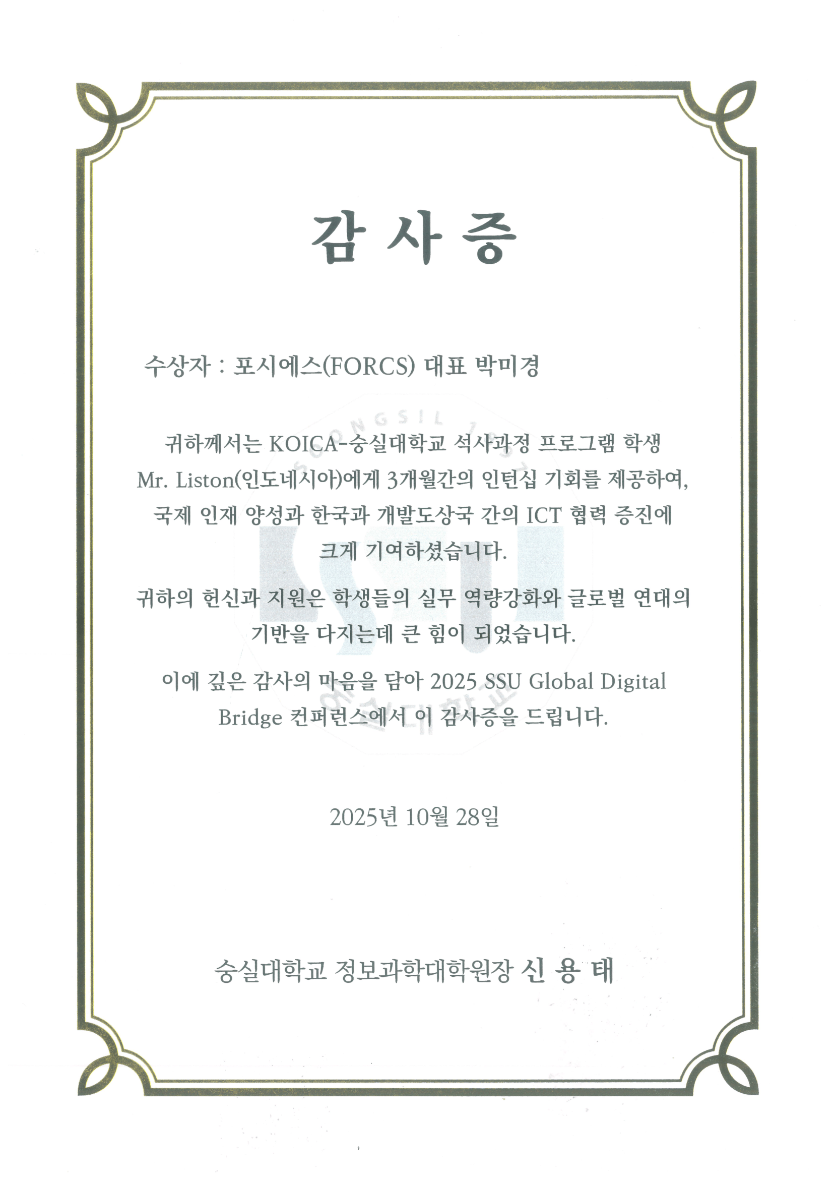 🏅 포시에스, 숭실대학교 글로벌 디지털 혁신 컨퍼런스 감사패 수여!