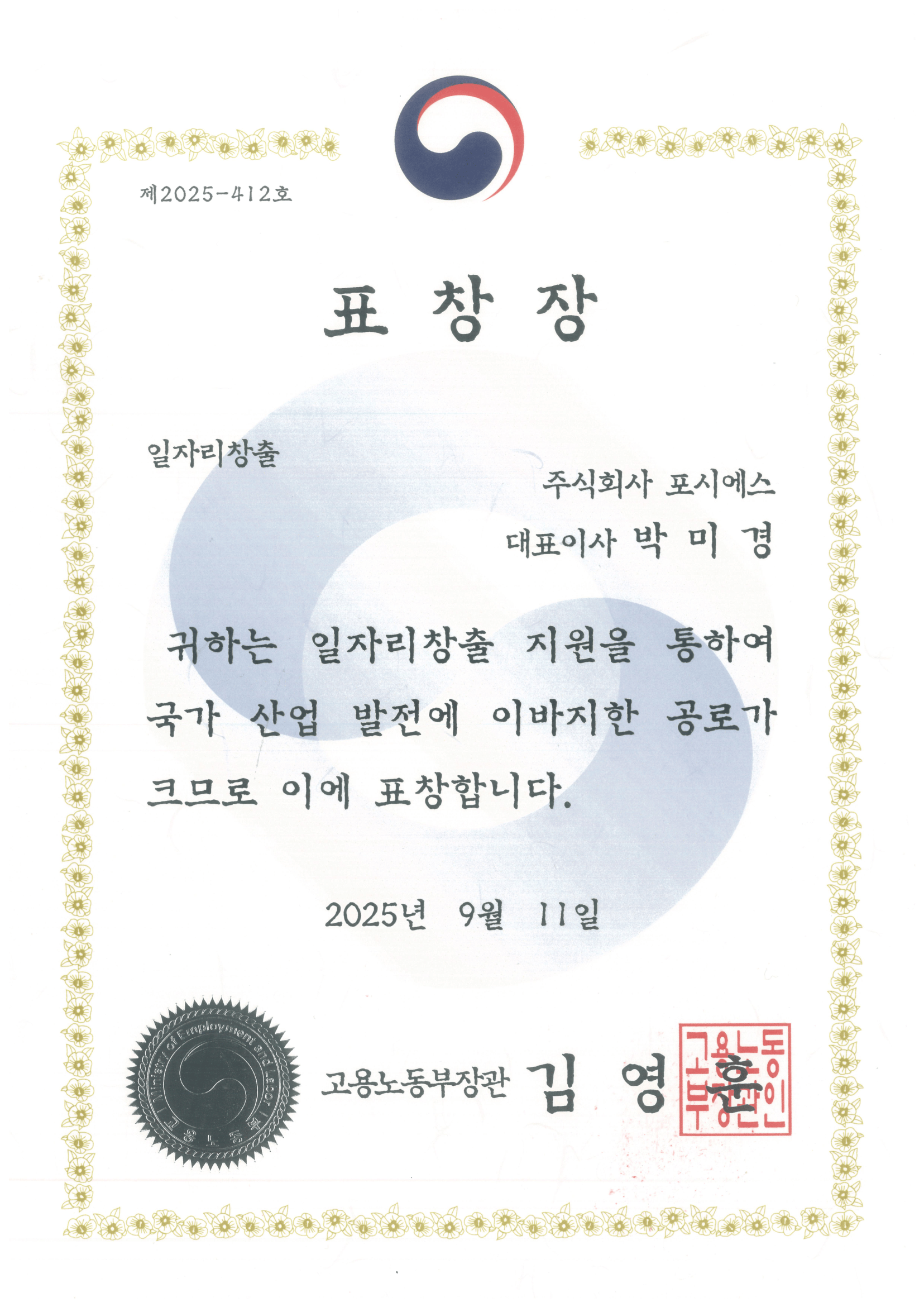 🏆 포시에스, 일자리 창출 유공 정부포상 고용노동부장관 표창 수상!