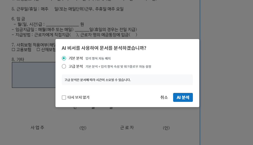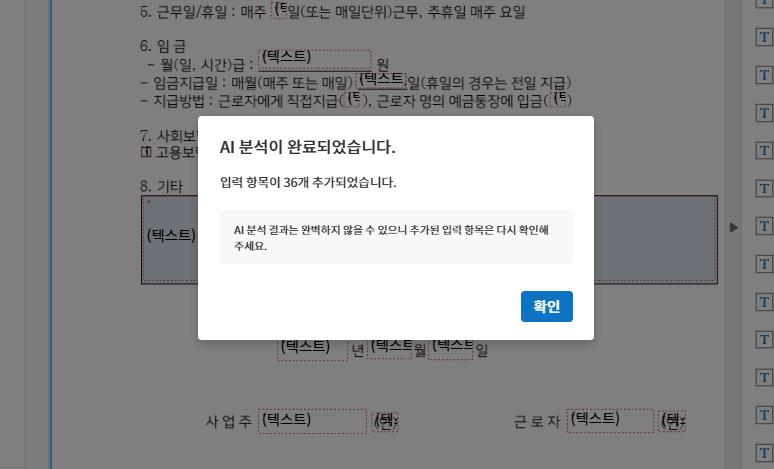 2. [AI 분석] 을 누르면 AI 비서가 근로계약서 양식을 분석하는데요. AI 분석이 완료되면 서명 요청 후 서명자가 작성할 입력 항목이 자동으로 배치됩니다✨