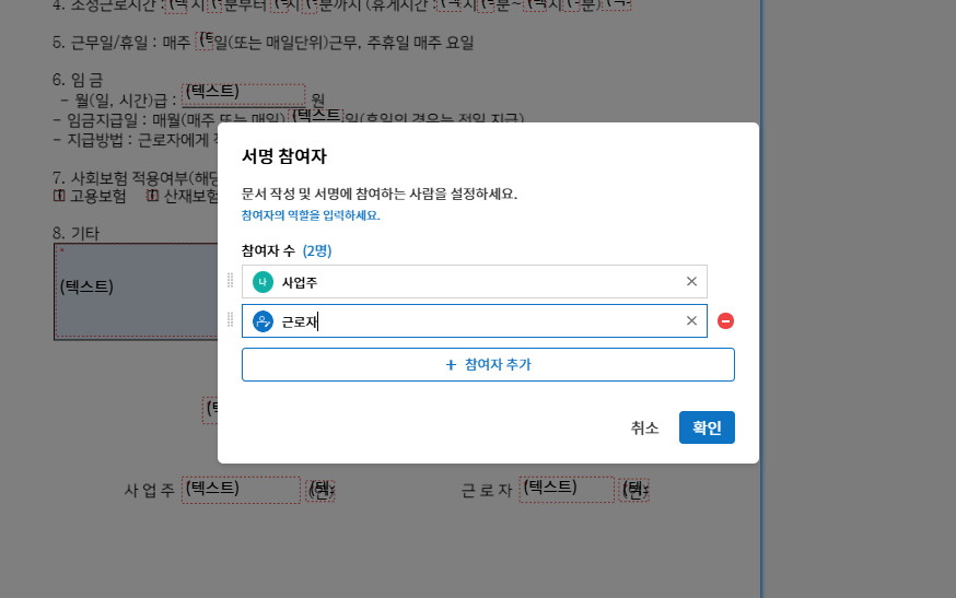 3. AI 비서로 자동 설정된 [서명 참여자] 는 고급 분석 워크플로우 설정에서 다시 확인할 수 있어요!근로계약서의 경우 사업주와 근로자가 자동으로 추가되었습니다🙂