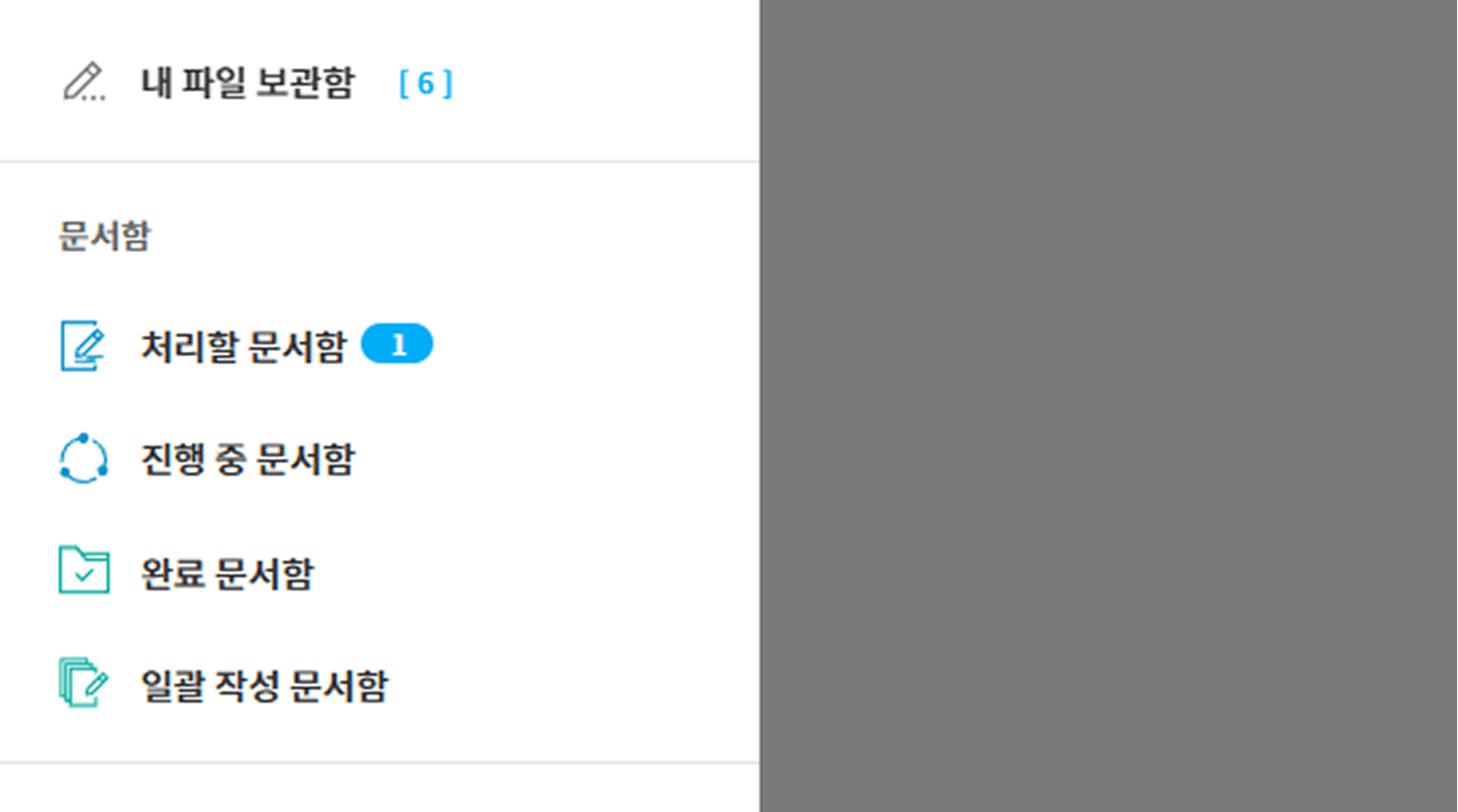 1. 이폼사인 대시보드 왼쪽에는 [문서함] 메뉴가 있습니다. [처리할 문서함] 에는 사용자가 서명 또는 처리해야 하는 계약서를, [진행 중 문서함] 에서는 현재 완료 전인 모든 문서를 확인할 수 있어요! [완료 문서함] 에는 서명 완료된 문서가 안전하게 보관됩니다.