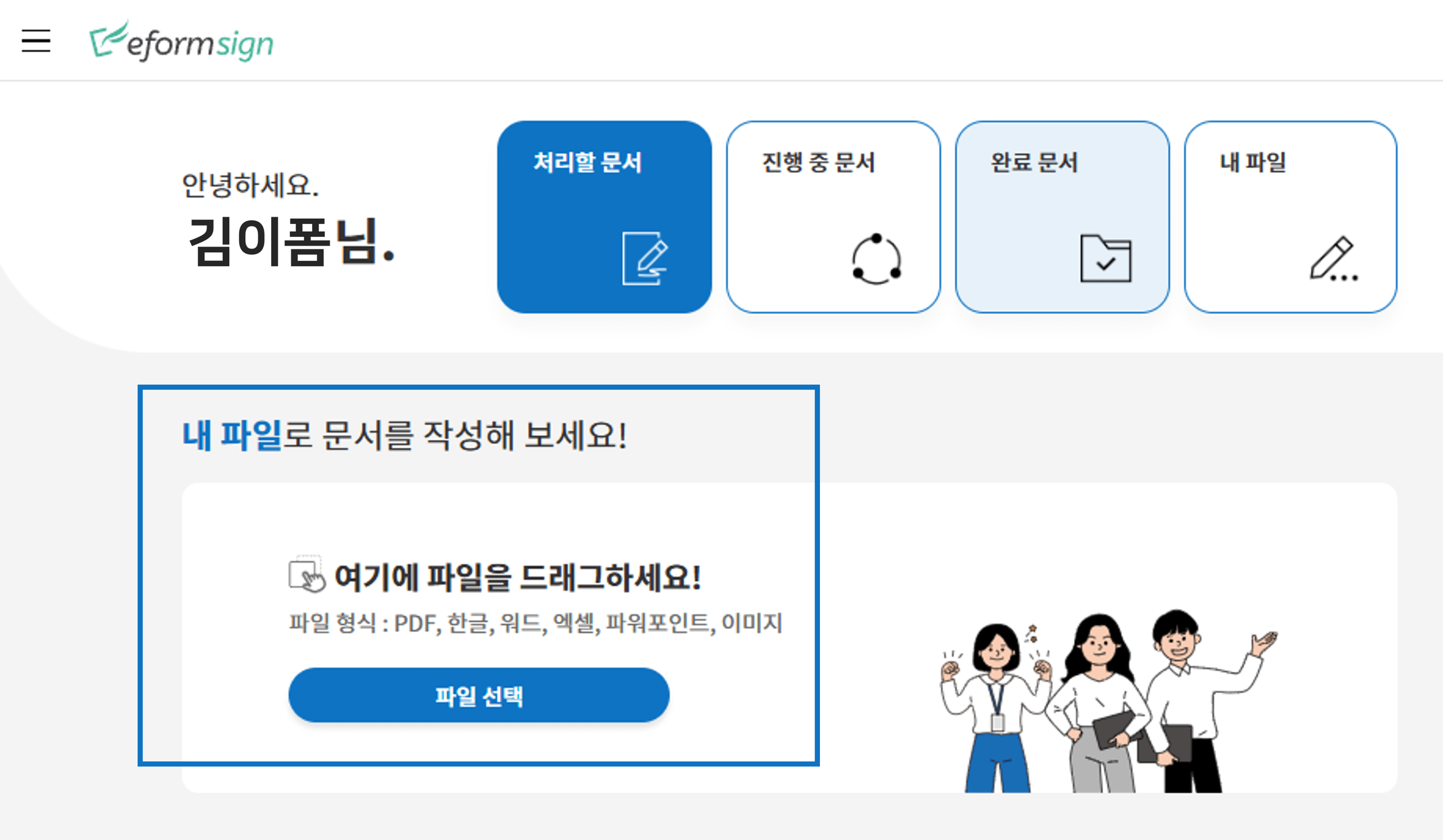1. 이폼사인에서 무료 체험을 시작하세요!✅ 회원가입 후 메인 화면에서 [eformsign 시작하기] 에 들어가 [내 파일로 문서 작성] 으로 필요한 문서(한글, pdf, 엑셀 등)를 불러와 주세요.