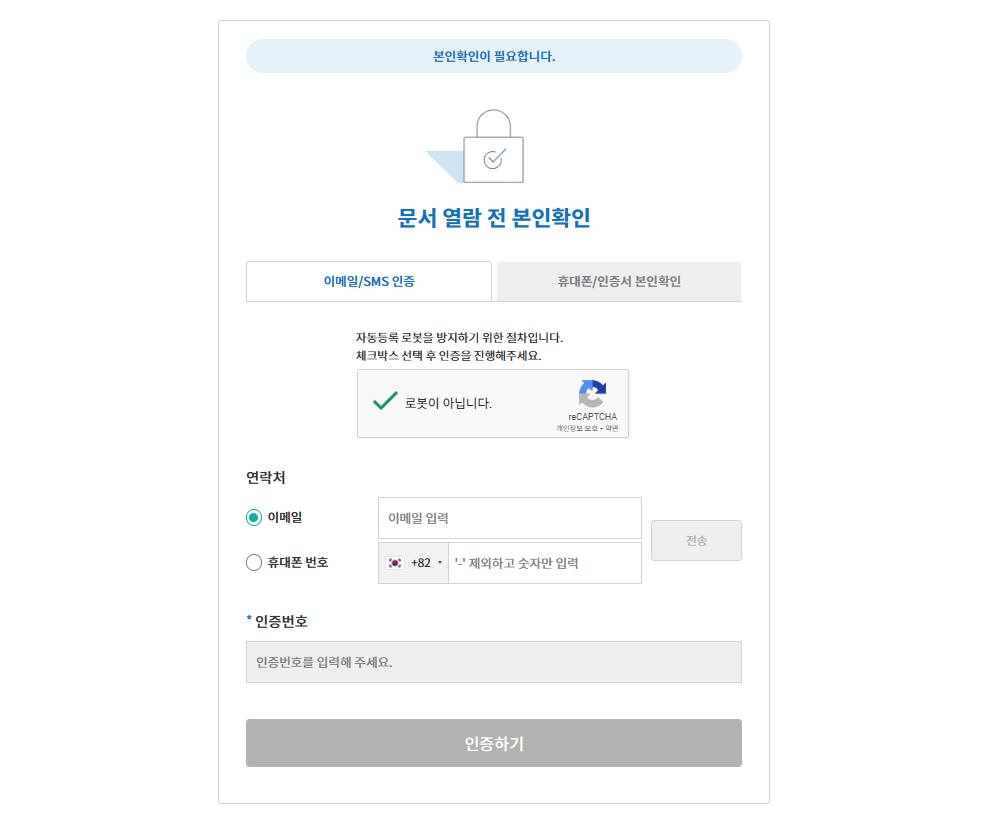 1. [문서 열람 전 본인확인] 을 진행합니다. 이메일, SMS, 인증서 중 가장 편한 방법을 골라 진행 가능하며, 이폼사인에서는 업계 유일 간편 인증(네이버, 카카오, PASS)을 할 수 있습니다🧐