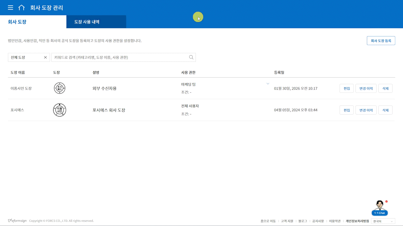 - 회사 관리 > 회사 도장 관리 페이지로 이동합니다.