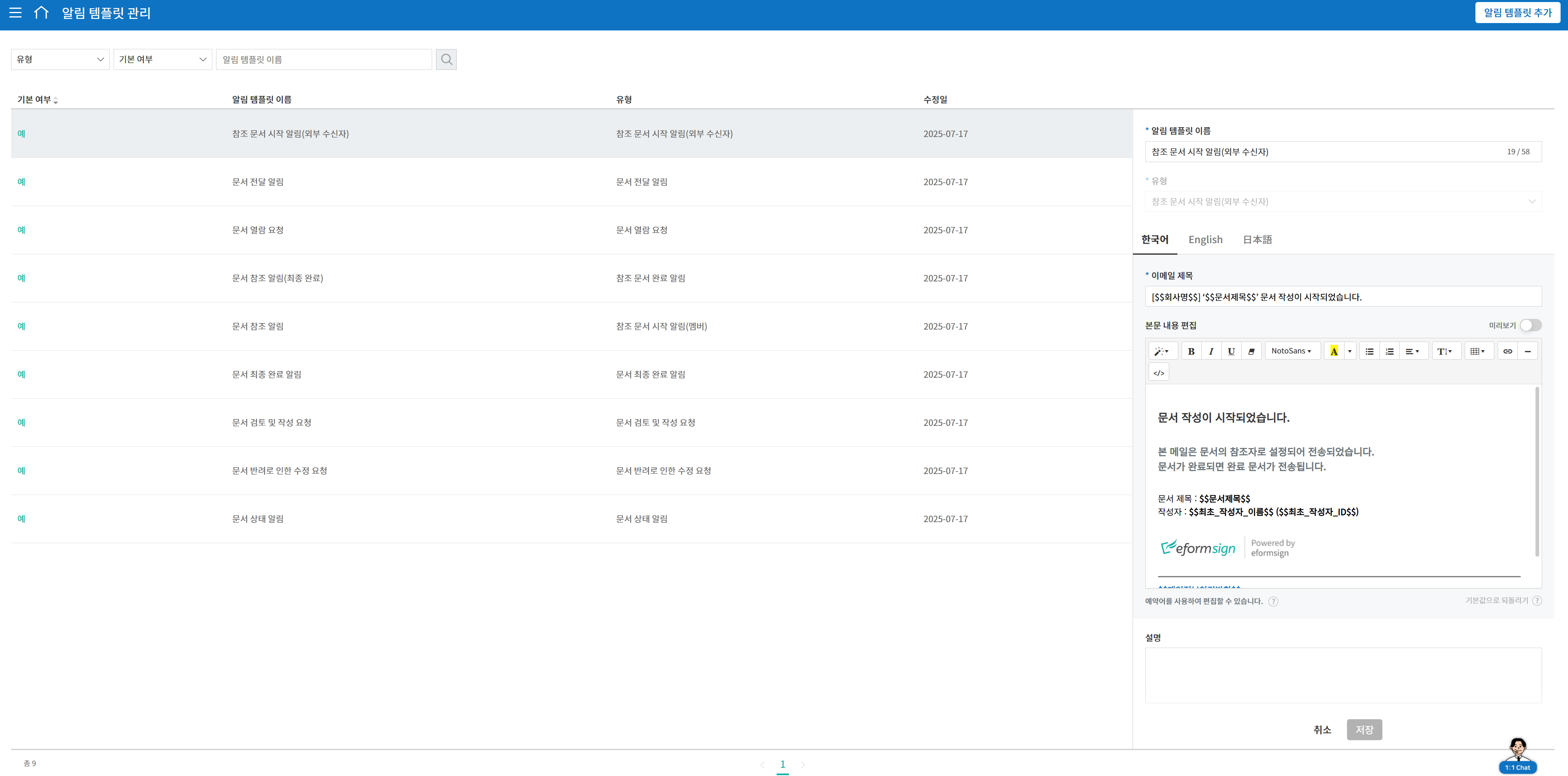 회사 관리 > 알림 템플릿 관리에는 기본 제공되는 9종의 알림 템플릿에 대해 영어, 일본어 버전이 함께 제공됩니다.