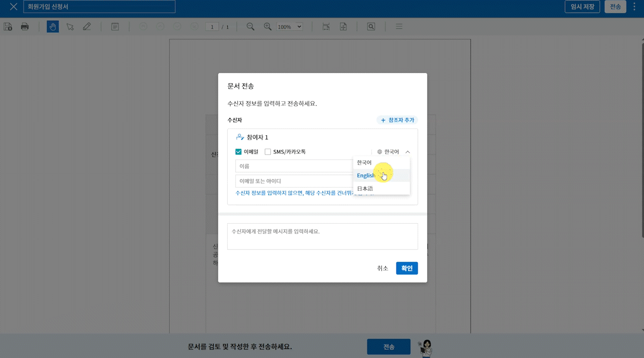 – 템플릿 설정에서 추가한 언어 기준으로 문서 전송 팝업에서 실제 알림 발송 언어 선택 옵션이 표시됩니다.