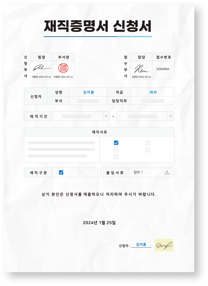 신청·발급 절차 간소화 : 재직증명서 신청서를 전자문서로 통합해 신청부터 승인까지 한 번에 처리할 수 있습니다.